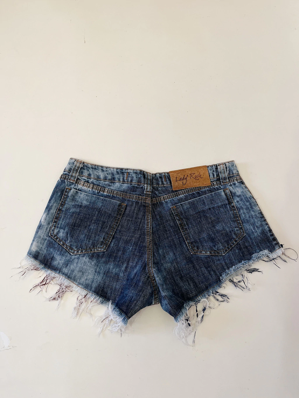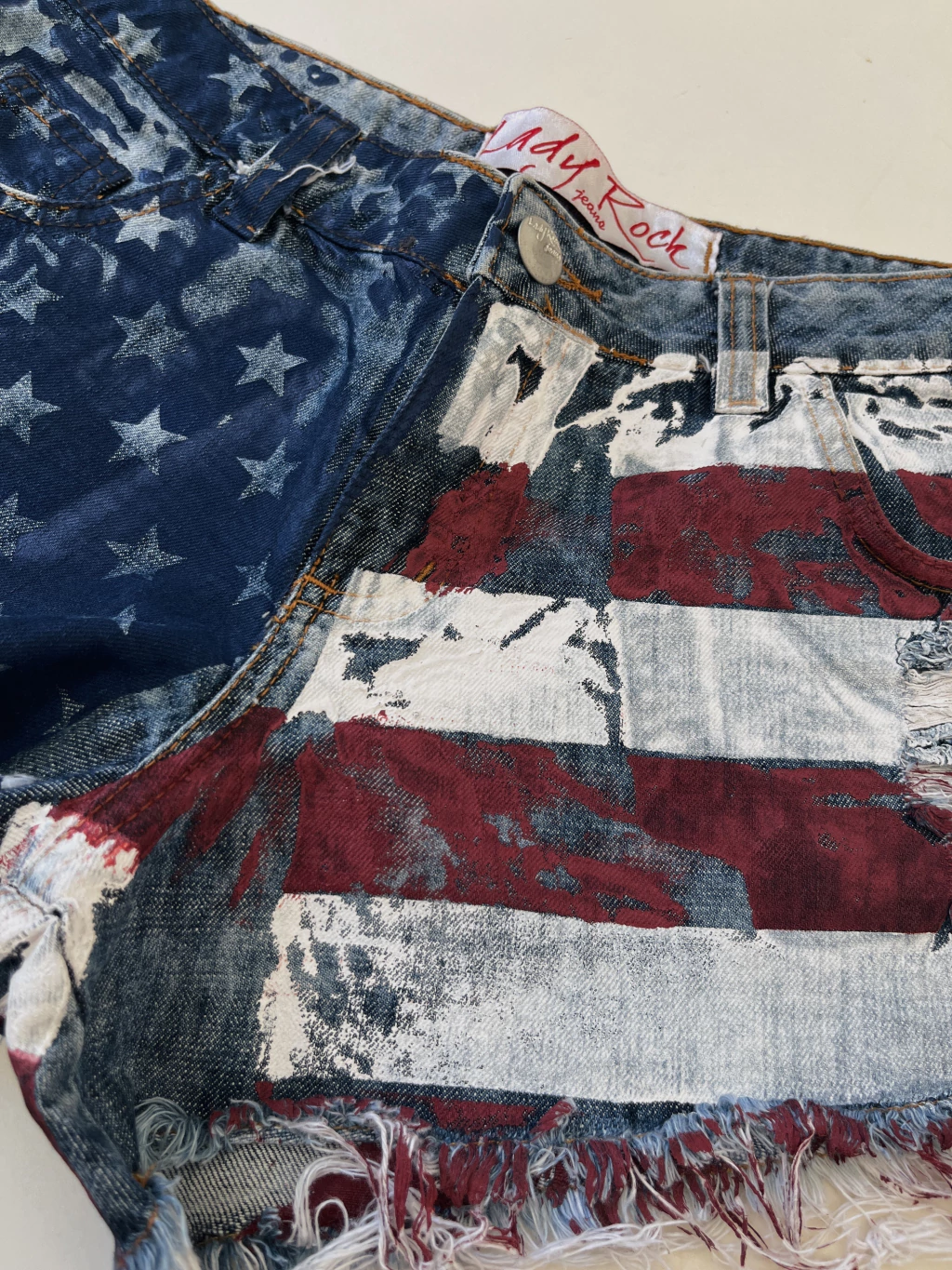 Estampado silk bandeira na parte da frente com alguns desfiados na barra